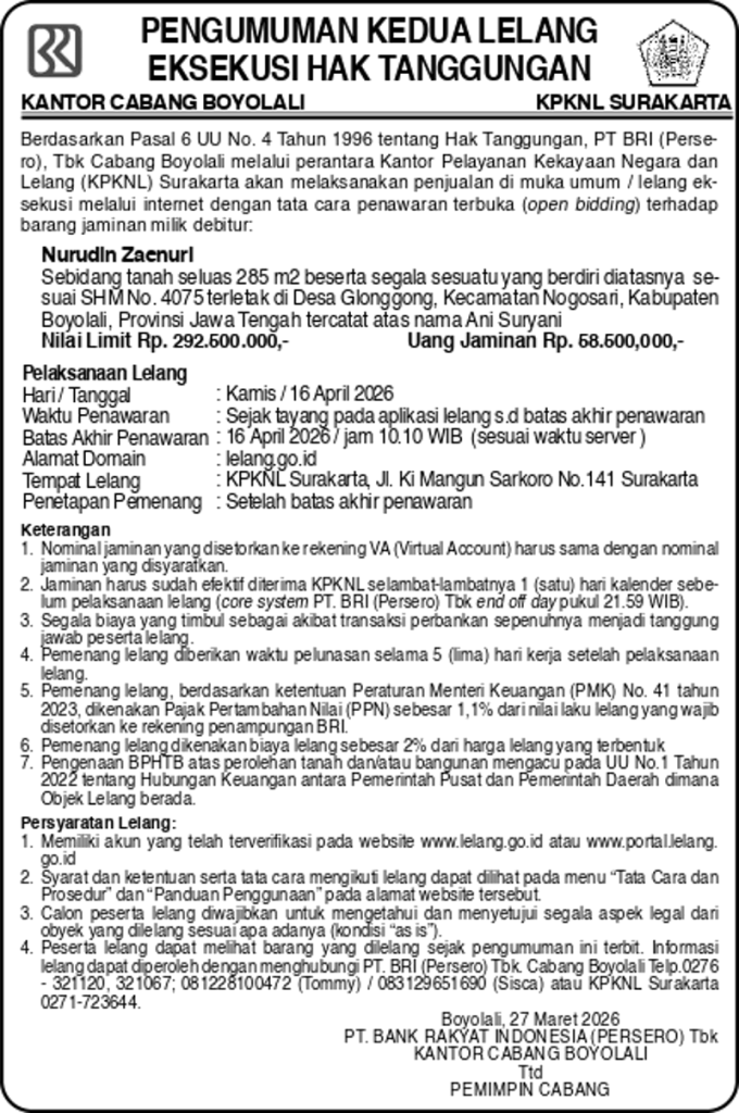BRI Kantor Cabang Boyolali mengumumkan lelang kedua akan diadakan pada Kamis (16/4/2026). Objek lelangnya adalah sebidang tanah dan bangunan di Desa Glonggong, Kecamatan Nogosari, Kabupaten Boyolali, Provinsi Jawa Tengah, dengan luas tanah 285 meter persegi beserta segala sesuatu yang berdiri di atasnya sesuai SHM No. 4075.